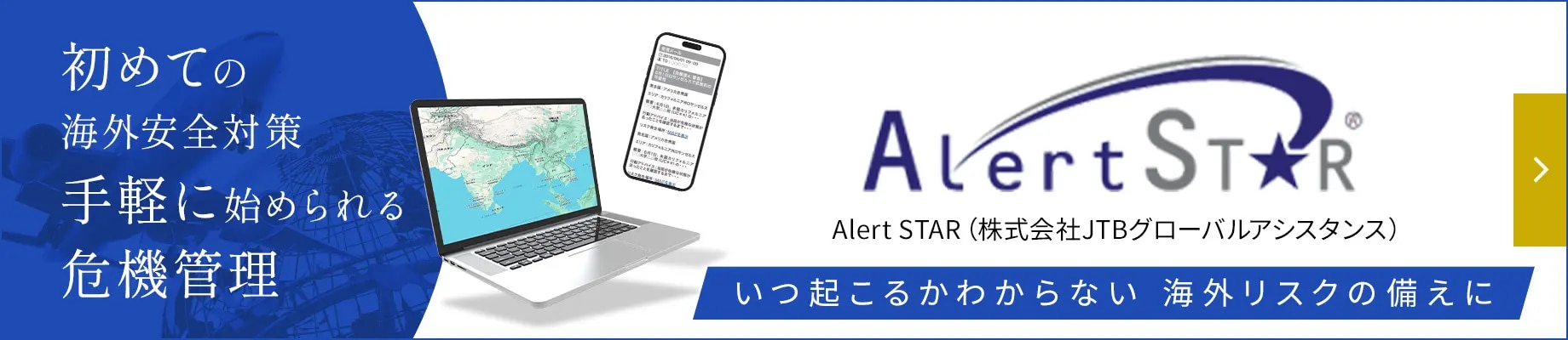 JTBグローバルアシスタンスでは、台湾とその周辺国で発生している様々なリスクを危機管理担当者・海外渡航者へリアルタイムでお知らせするサービス「アラート☆スター」を提供しております。