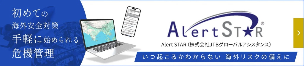 JTBグローバルアシスタンスの「アラート☆スター」は、安全管理体制構築に必要なサービスを提供し、貴社の従業員の安全をサポートするためのサービスを提供しています。